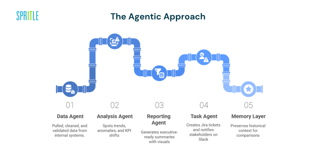 • Analysis Agent: Spotted trends, anomalies, and KPI shifts.