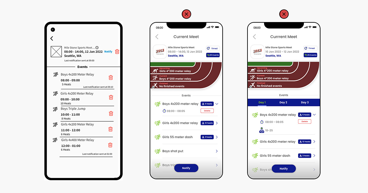 This screen had to undergo countless changes since we had the concept of multi-day events for a single meet. A question arose for the development team as to how to display the multi-day events and all other app features dependent on the events list?