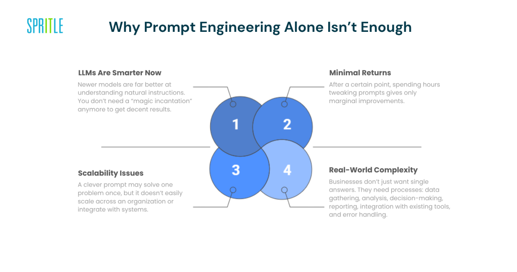 A clever prompt may solve one problem once, but it doesn’t easily scale across an organization or integrate with systems. - Real-World Complexity