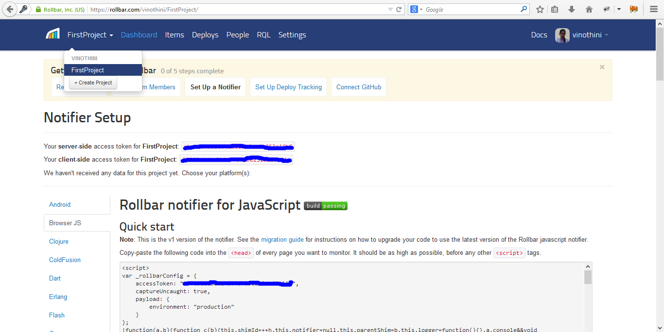 Step 8: Now you can see the steps to integrate rollbar in the application.